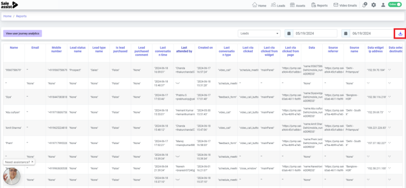 &#x20;4\.  You can download the fetched data by clicking on the download button. In this report you can see all the details of the lead like name, email, contact no., lead type, lead status and lead attended by etc.