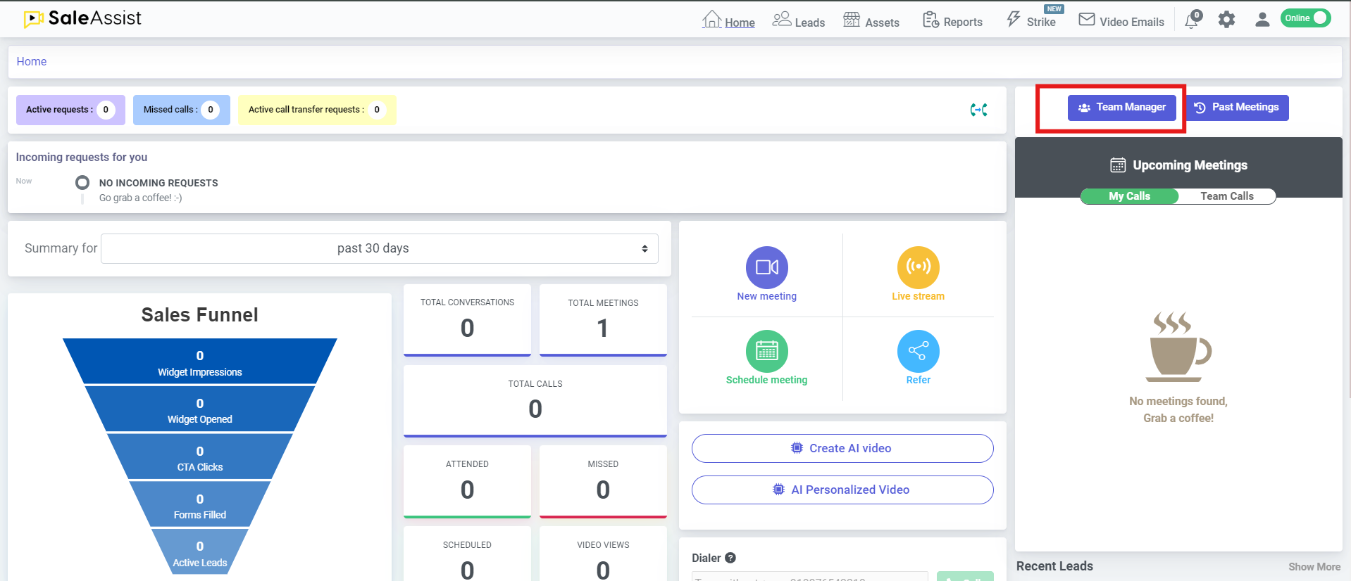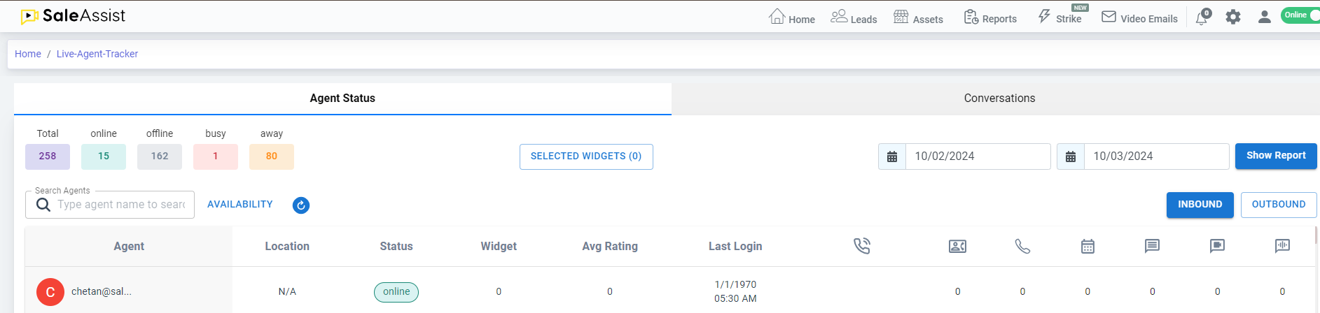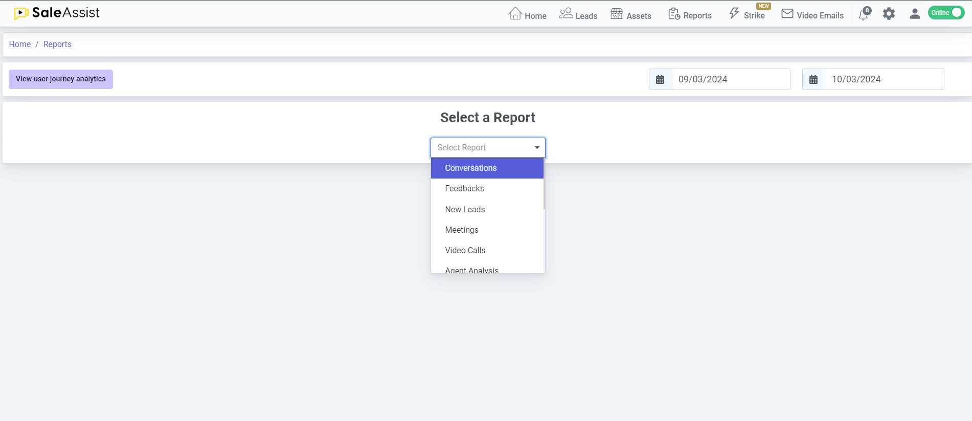 &#x20;3\. Select the report type form the “Select a Report” drop down. You will have multiple choices like conversations, leads, feedback and meeting etc. on the basis of which you can generate the report.
